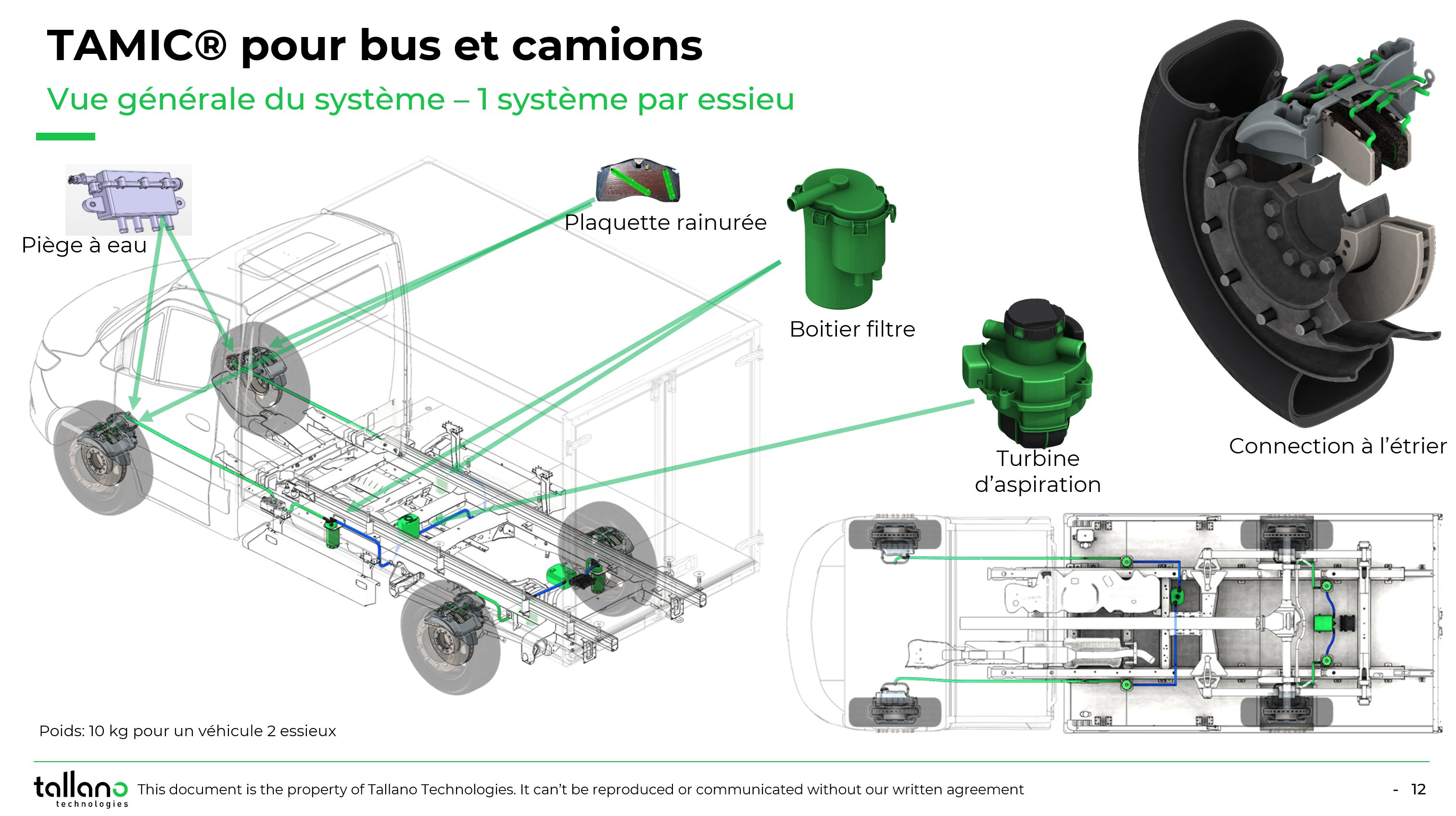 La technologie TAMIC®, développée par Tallano Technologies, est un système actif de captation des particules fines issues du freinage, destiné aux véhicules routiers et ferroviaires. Les particules de freinage, composées notamment de métaux lourds et de carbone, représentent une part importante de la pollution de l’air en zone urbaine et constituent un enjeu sanitaire majeur.
