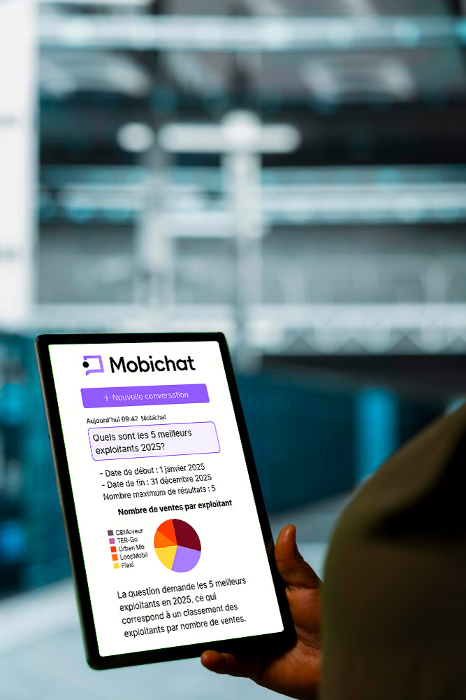 Fini les longues navigations à travers des menus complexes ou des écrans multiples. Avec Mobichat, il suffit de poser une question : « Quel est le nombre de ventes en 2024 mois par mois ? », « Quel est la part d'usagers occasionnels ? » ou encore « Combien de validations le 17 Mai entre 10h et midi et entre 16h et 21h » ? En quelques secondes, l’outil comprend, traite et fournit une réponse claire et ciblée, sans détour.